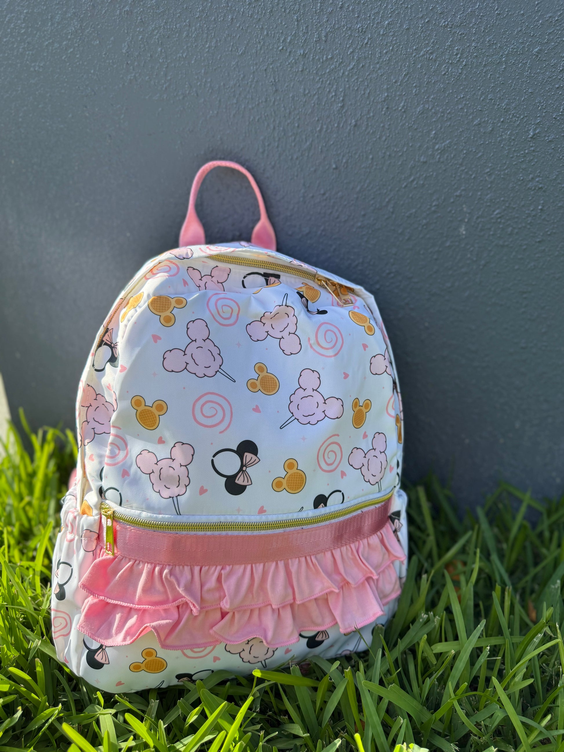 - Spacious exterior zipper pocket accented with adorable pink ruffles for a fun, feminine flair